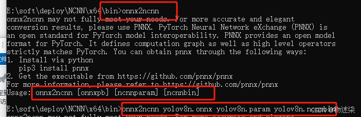 在下载的ncnn的X64/bin中打开cmd,运行onnx2ncnn查看运行格式;