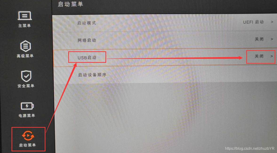 选择启动菜单---将启动模式改为 UEFI 启动(了解UEFI启动和Legacy启动的区别)----USB启动打开