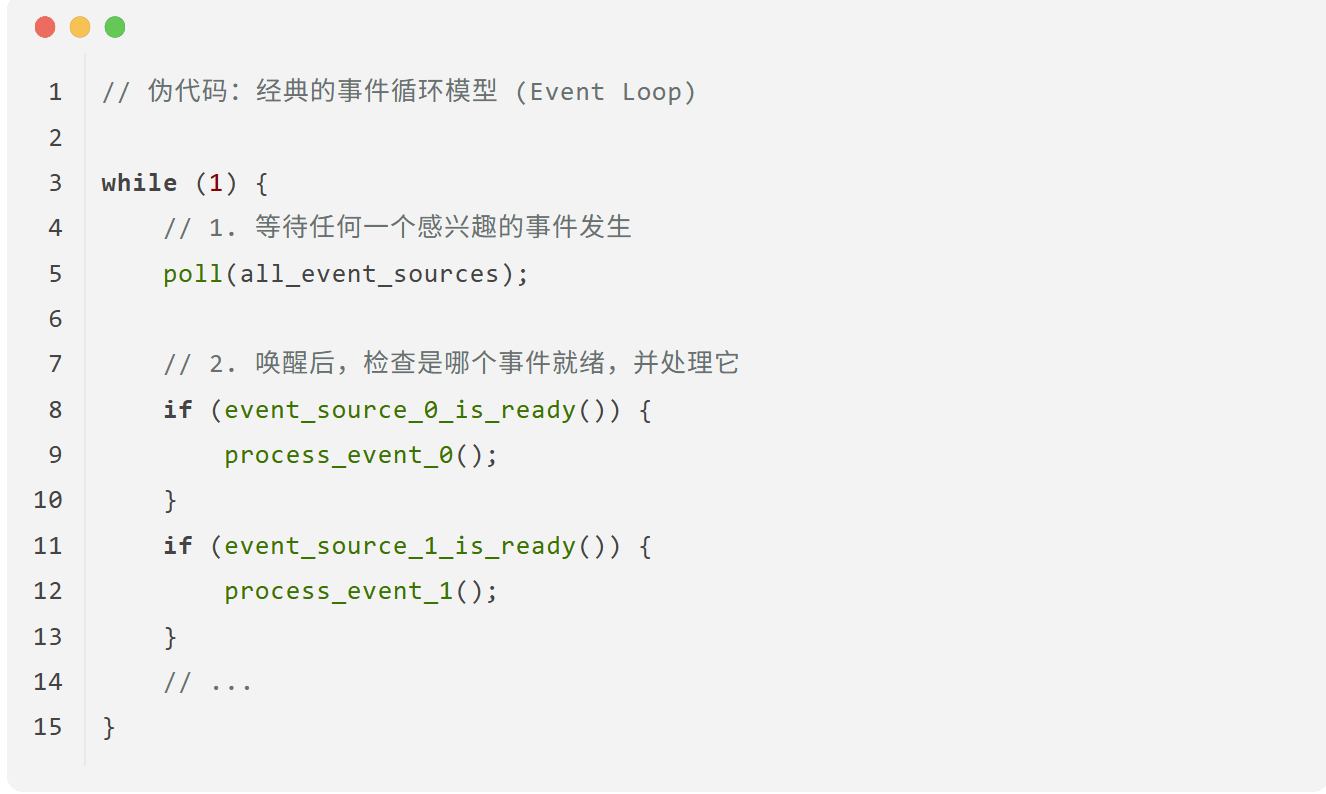 poll(all_event_sources):这是整个模型的心脏。它不再是让 CPU 在while循环里空转,而是执行一个特殊的“等待”操作。这个操作会告诉系统内核:请把我挂起(暂停),直到我关心的这些事件源(all_event_sources)中有任何一个发生了事情。在我等待期间,请让 CPU 去休眠或服务其他程序。 -