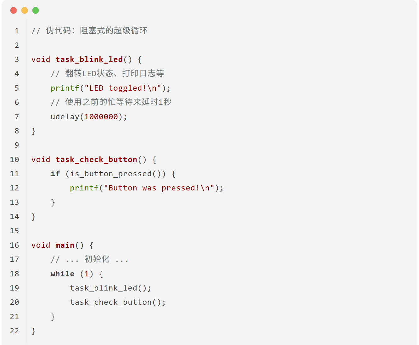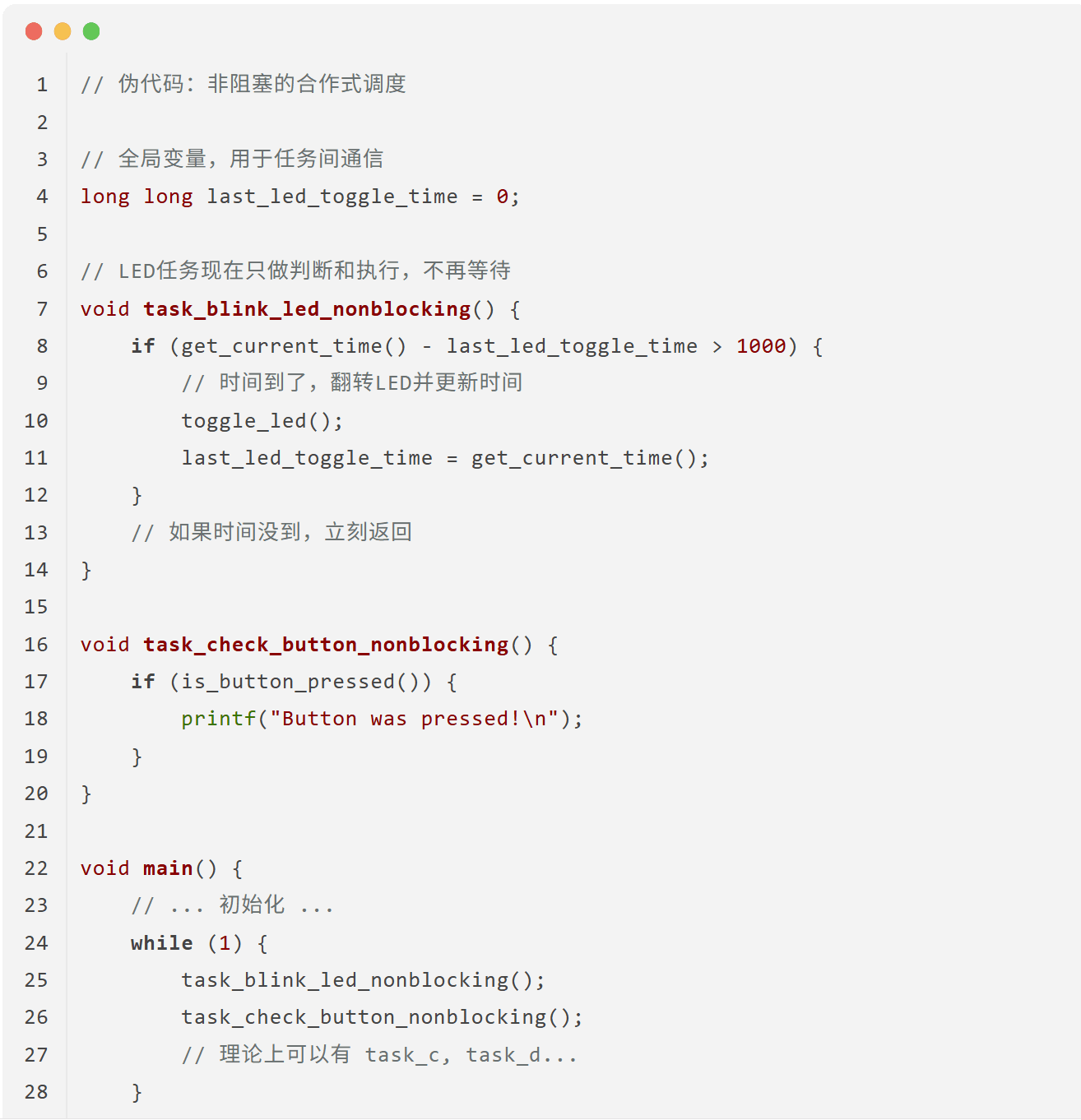 task_blink_led()函数包含了一个长达 1 秒的延时udelay()。在这 1 秒内,CPU 被完全占用,task_check_button()根本没有机会执行。这意味着,用户必须在 LED 恰好熄灭或点亮的那一瞬间按下按键,才有可能被检测到,这几乎是不可能的。整个系统响应变得极慢。2. 无优先级:即使有些任务更紧急(比如处理用户输入),它们也必须乖乖排队,等待前面的任务执行完毕。
