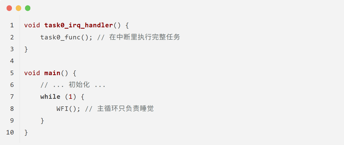 有了中断,我们的 while(1) 循环终于可以安心地休眠了。基于中断,我们演化出两种典型的编程模型。