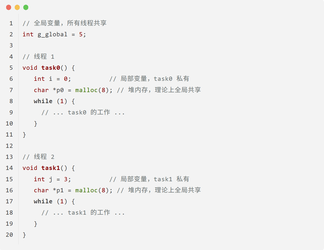 1. 线程栈是私有的:每个线程(Task 或 Thread)都有自己独立的栈,它们之间不共享。这是线程独立运行的基础。