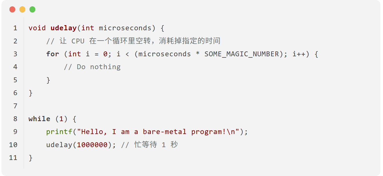 如果觉得打印太快,我们可能会想让 CPU “等一等”。但在没有操作系统的情况下,我们没有 sleep() 这样的函数。最直接的办法是让 CPU 做一些无用功来消耗时间,这被称为“忙等待”(Busy Wait)。
