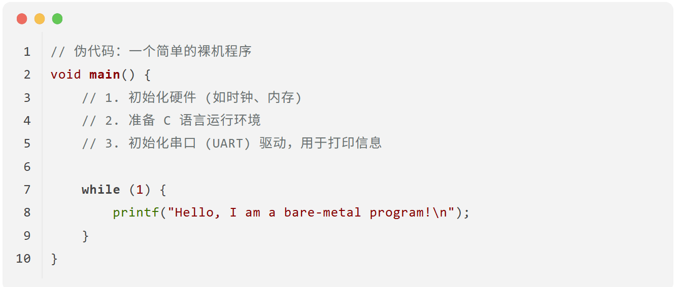 在没有操作系统的硬件上直接运行程序,我们称之为“裸机”(Bare-metal)编程。一个最简单的裸机程序,可能就是一个无限循环: