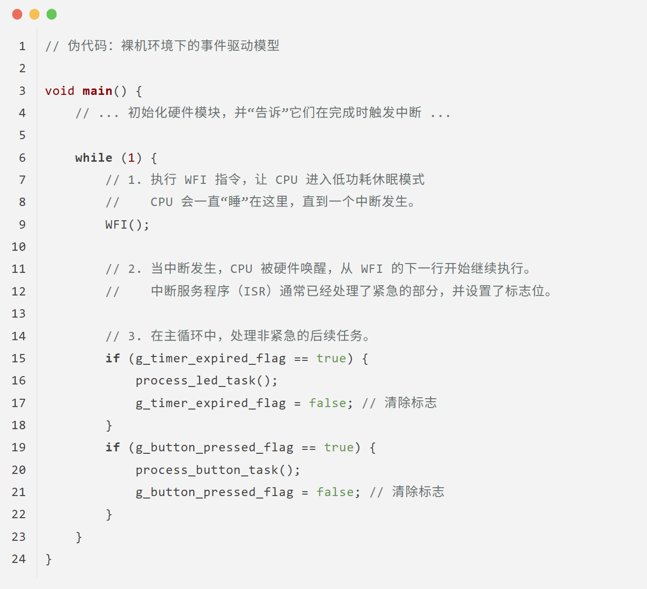 所以,上面那个经典的事件循环,在我们的裸机世界里,就“翻译”成了这样: