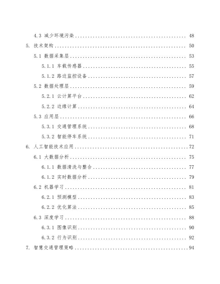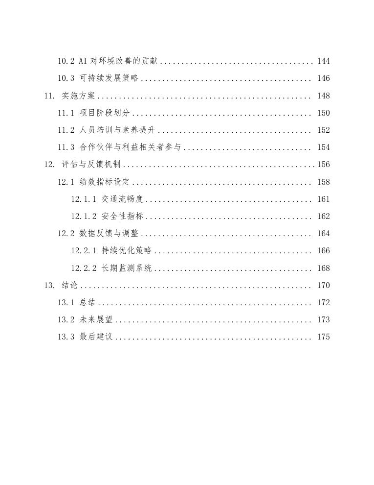 通过这些关键举措的实施,不仅可以缓解城市交通压力,提升通行效率,还能够改善居民的出行体验,促进经济的可持续发展。此外,智慧交通的有效推行将对政府公共管理能力的提升、城市整体形象的改善以及环境保护的目标实现产生积极影响。因此,围绕人工智能驱动的智慧交通优化实施方案的研究与实践,具有重要的现实意义和深远的社会价值。