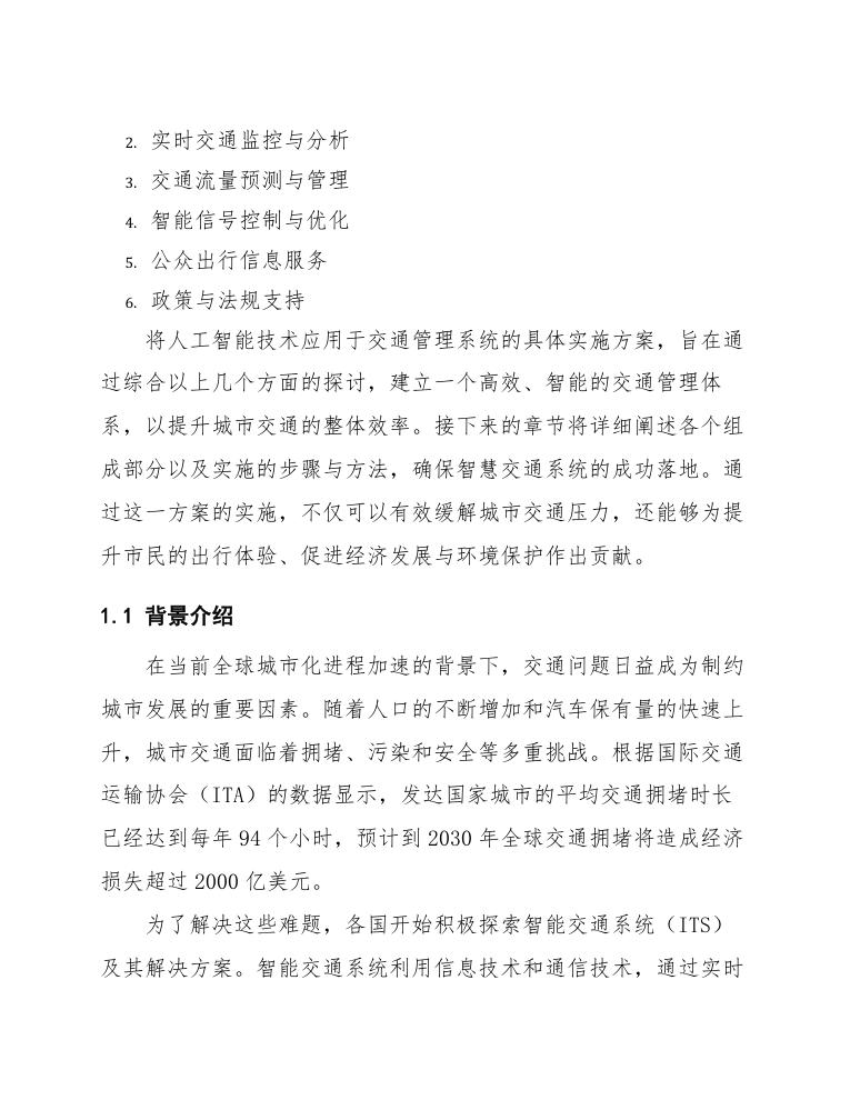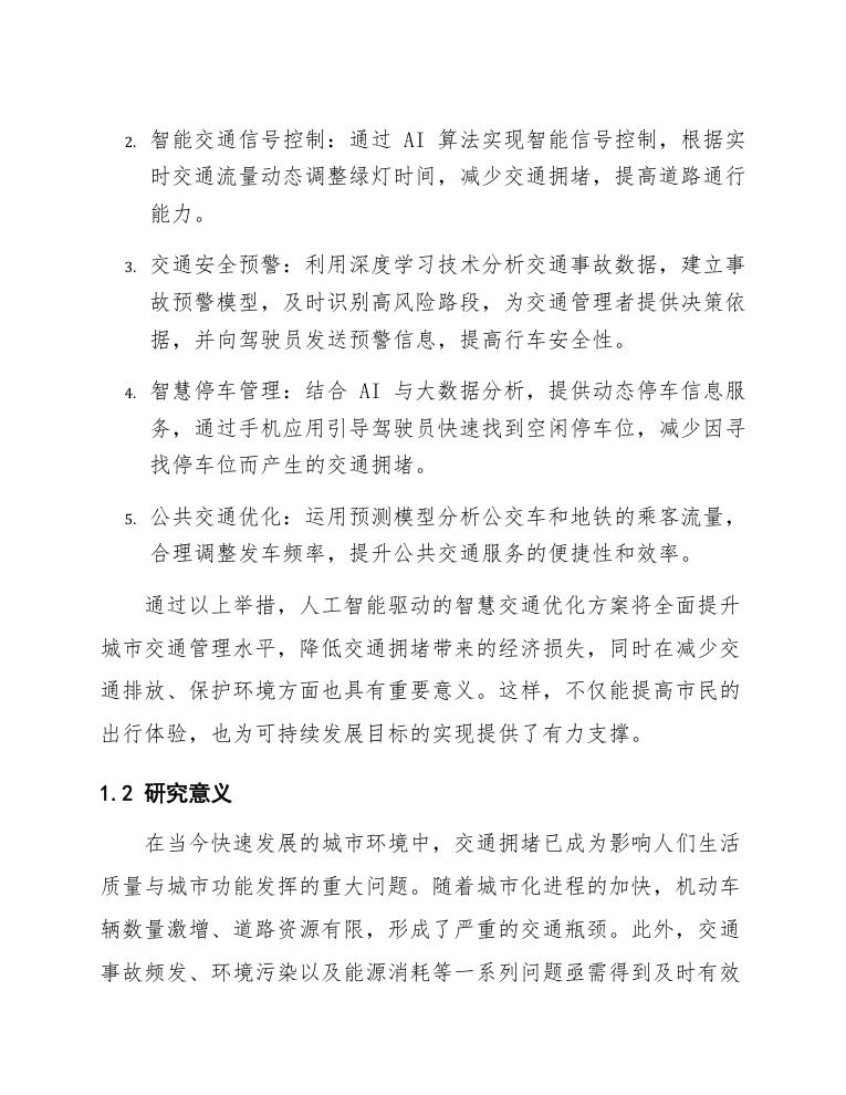 在当前快速发展的城市化进程中,交通 congestion 已成为制约城市功能优化和居民生活质量提升的重要瓶颈。为此,本实施方案旨在通过人工智能技术的应用,系统性地优化城市交通管理,提升交通运输系统的效率与安全性。具体目标包括建立智能交通监控系统、优化交通信号配时、提升公共交通服务质量等。