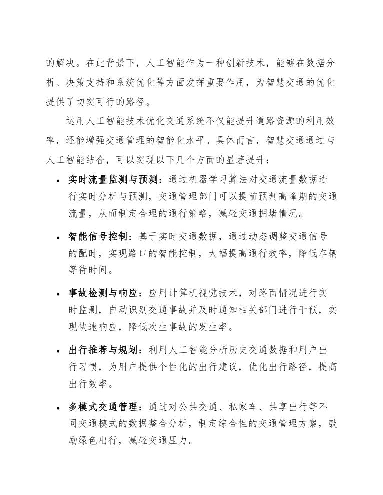 运用人工智能技术优化交通系统不仅能提升道路资源的利用效率,还能增强交通管理的智能化水平。具体而言,智慧交通通过与人工智能结合,可以实现以下几个方面的显著提升: