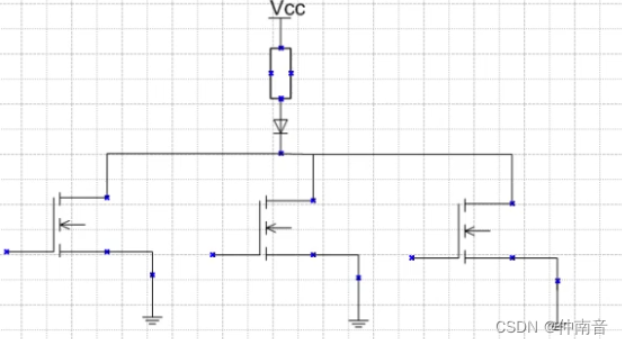 适用场景:用于电平转换的场合,以及通信线路,比如I2C,SPI的数据传输通信线路,这种线路通常要求实现线与状态,即其中一个IO输出低电平,则整条线路就会被拉低,MCU通过这种方式判断总线的状态。如下图: