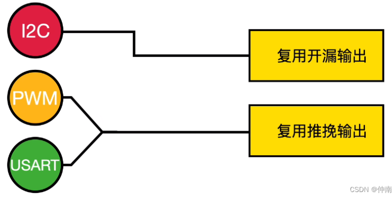 复用模式输出连接的是MCU的内部外设,例如PWM、USART、IIC。具体用复用开漏输出还是复用推挽输出,这个就要根据外设需求来设置,例如IIC在使用时需要用到线与特性,就必须在程序里配置IO引脚为复用开漏输出;像UART或者PWM功能,需要IO口高速变化确定的高低电平,则必须配置为复用推挽输出。