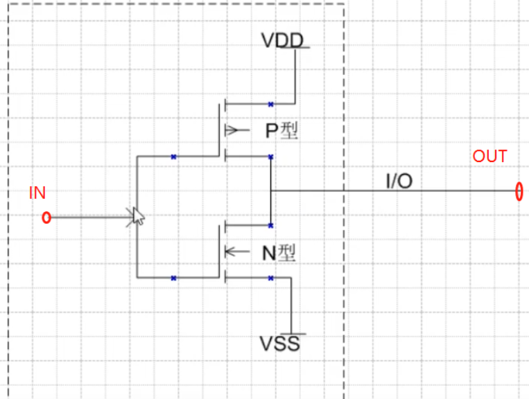 控制逻辑:当IN输出低电平时,P-MOS导通,N-MOS截止,IO输出VDD高电平,反之当IN输出高电平时,P-MOS截止,N-MOS导通,IO输出VSS低电平,无需外接上拉电阻或者下拉电阻(关于MOS管的工作原理请查看另一篇笔记)