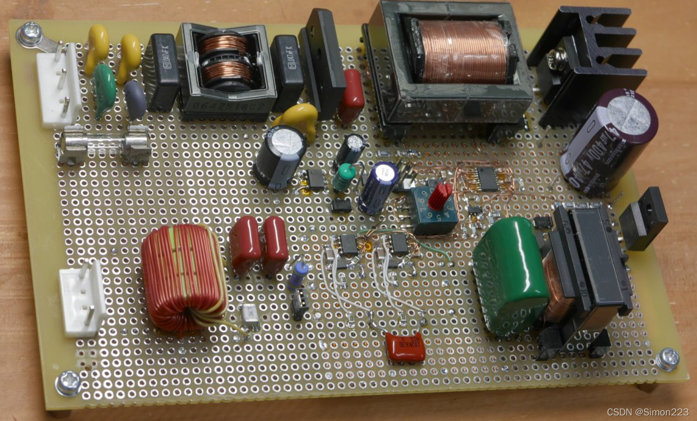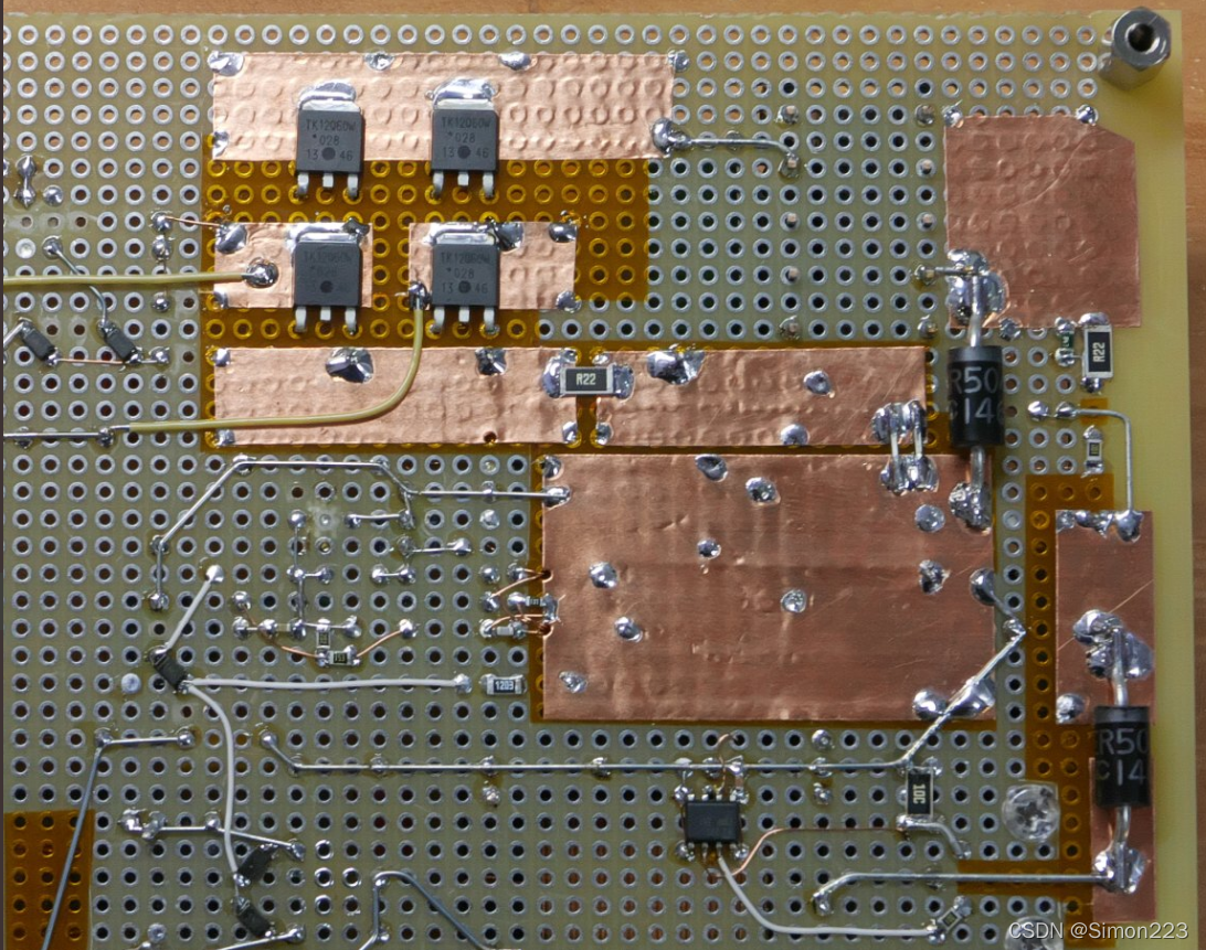 一如既往的漆包线风,手艺依旧很棒,这次设计的电源板,做成了双面板,并且做了铺铜设计,先铺绝缘层再铺铜皮。正面的器件需要接地就戳破绝缘层焊接到铜皮。