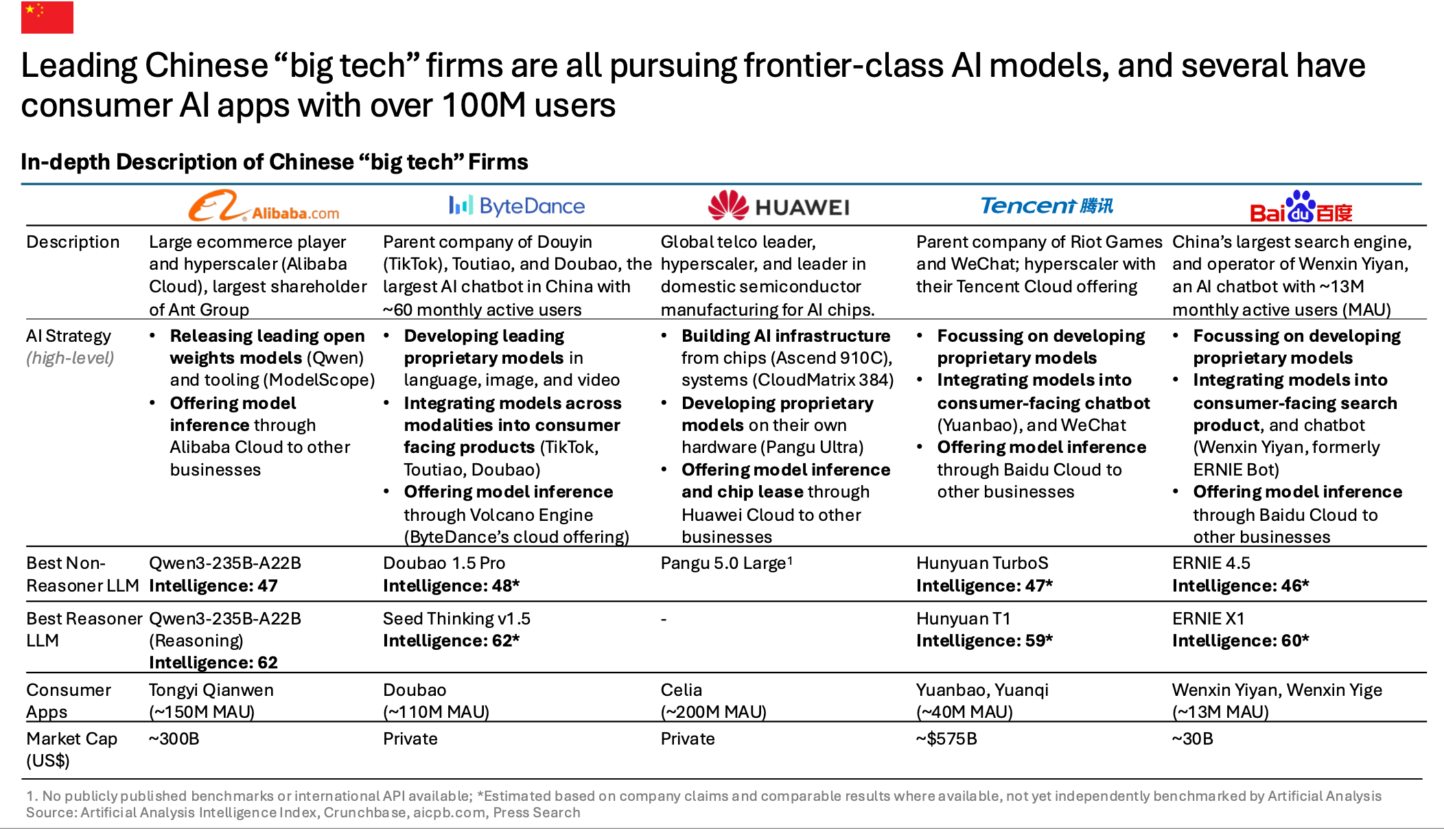 中国领先的“大型科技”公司都在追求前沿级AI模型,多家公司拥有用户超过1亿的消费级AI应用
