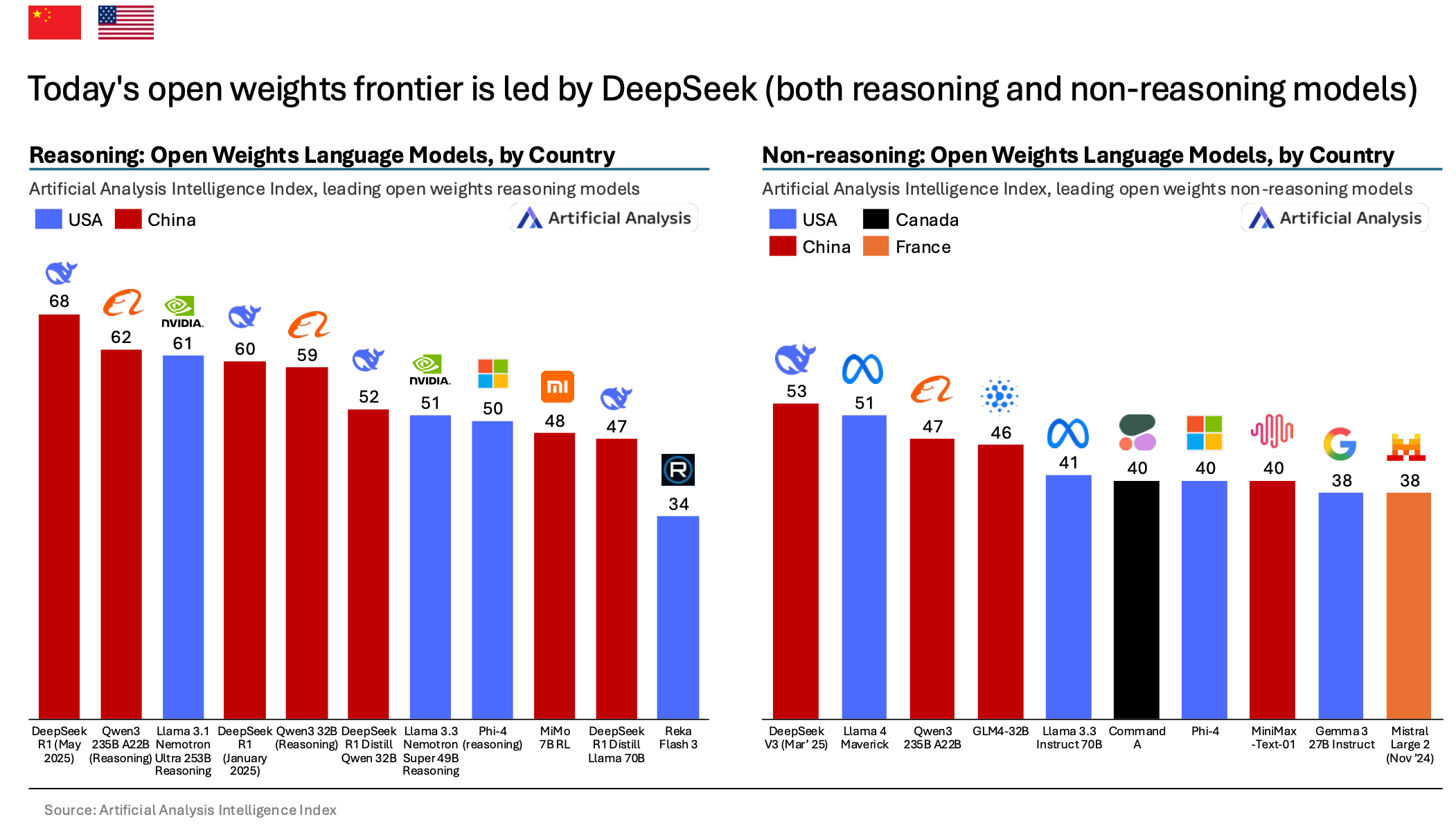 如今的开源权重前沿由深度求索主导(包括推理和非推理模型)