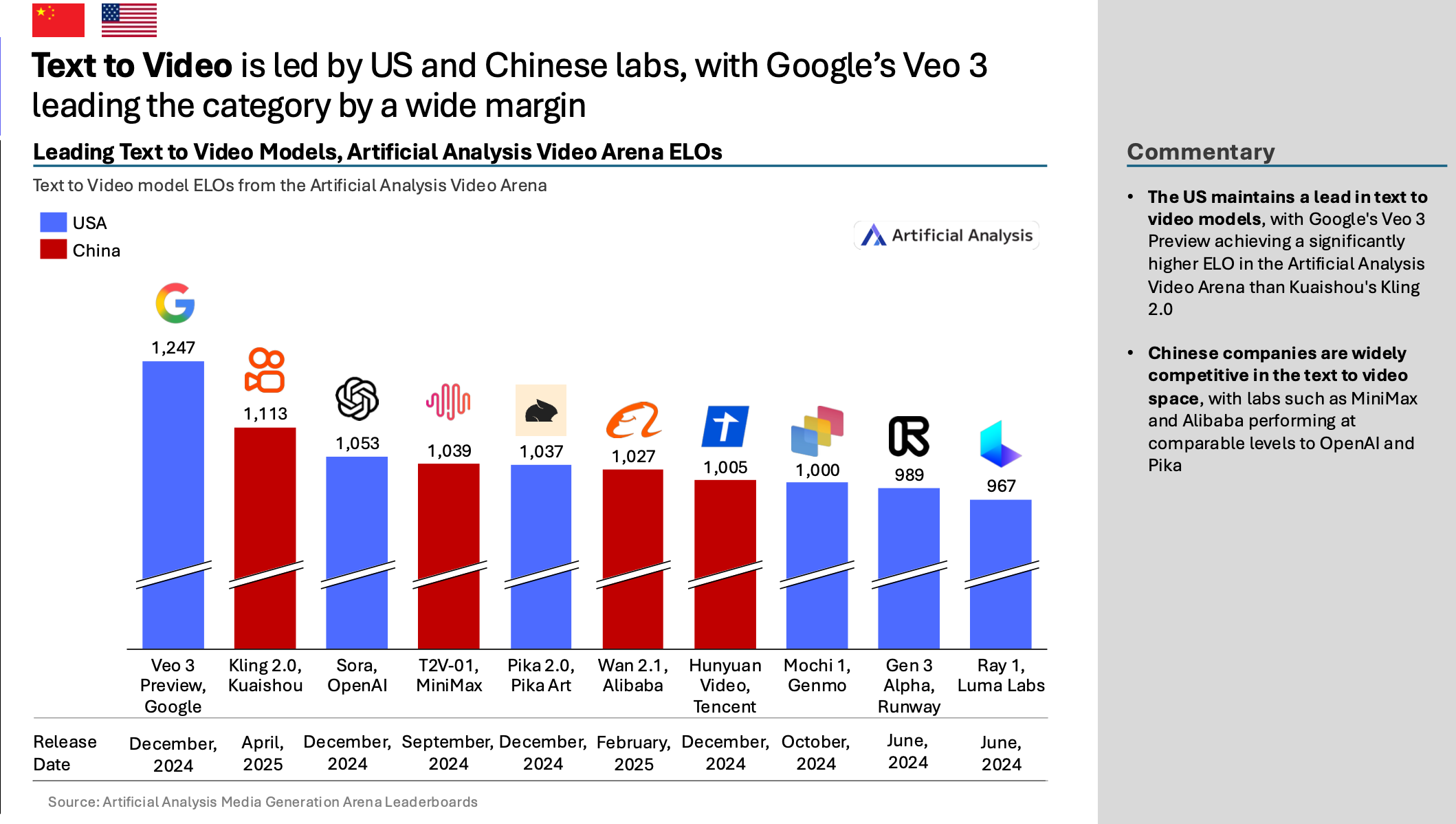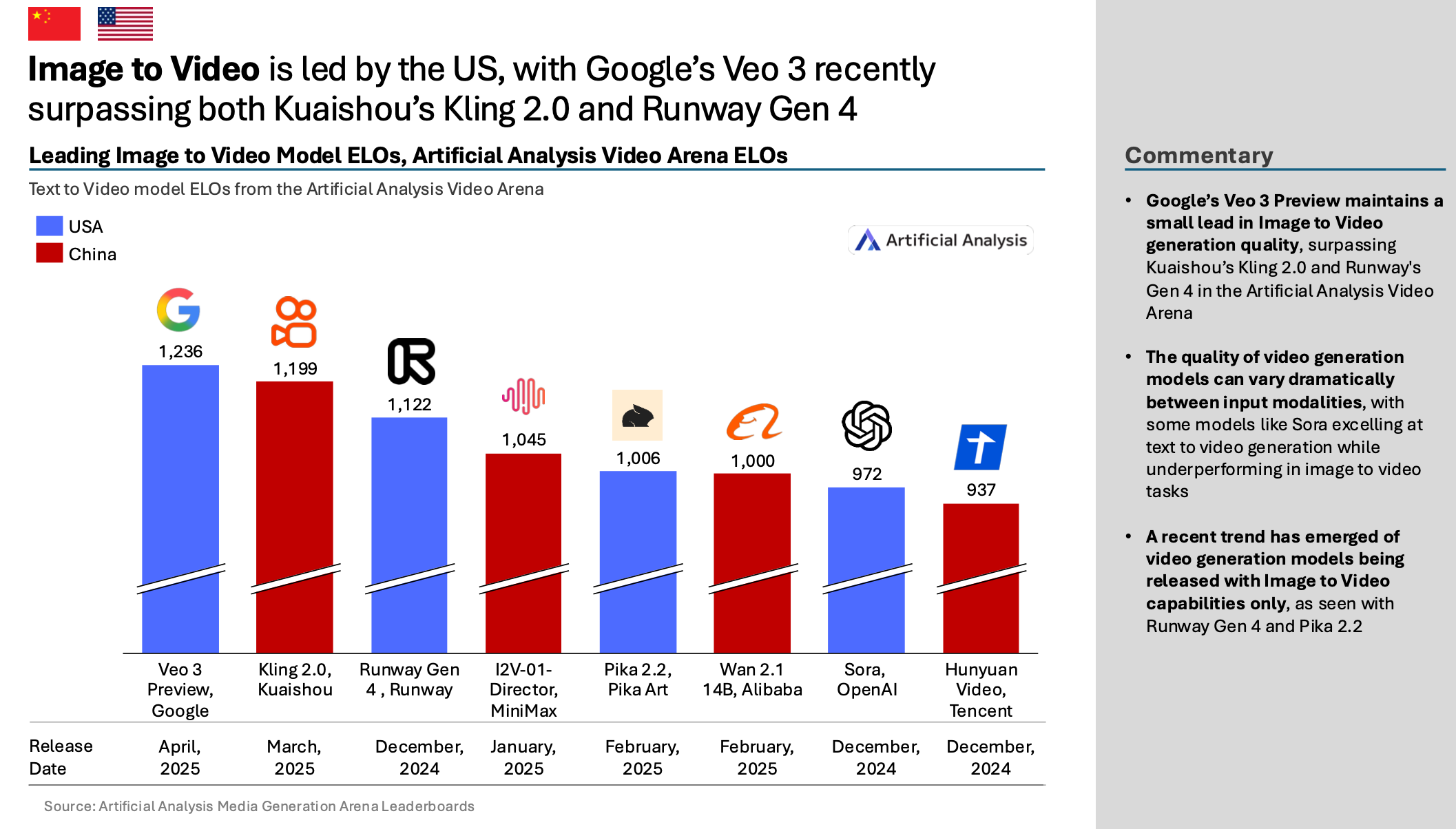 图像生成视频领域由美国主导,谷歌的Veo 3最近超越了快手的Kling 2.0和Runway Gen 4
