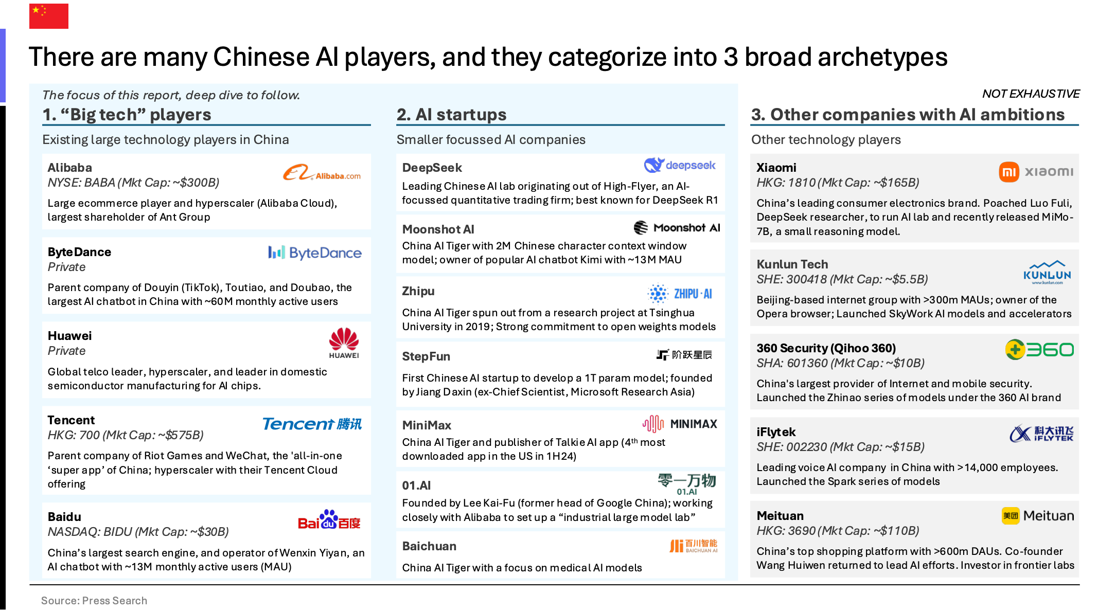 拥有200万汉字上下文窗口模型的中国AI新锐,热门AI聊天机器人Kimi(月活跃用户约1300万)的所有者,2019年从清华大学的一个研究项目剥离,坚定致力于开源权重模型。• 开发领先的专有模型(语言、图像和视频模态)<br>• 通过火山引擎(字节跳动的云服务)将模型集成到面向消费者的产品(TikTok、今日头条、豆包)中。深度求索(DeepSeek)的开源权重模型R1(2025年5月)领先于中国