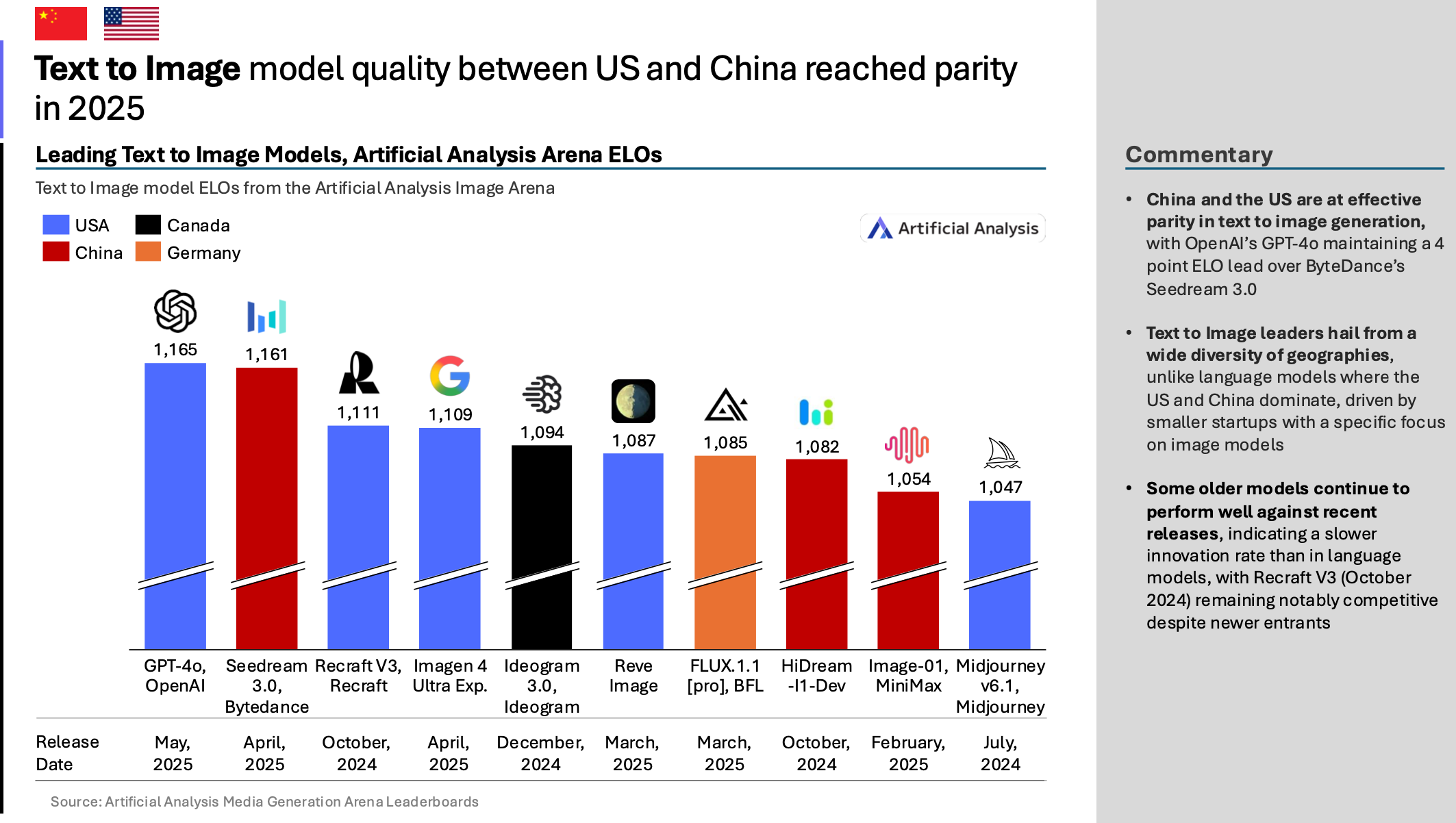 与语言模型领域由中美主导不同,文本生成图像领域的领先者来自广泛的地域,由专注于图像模型的小型初创公司推动。