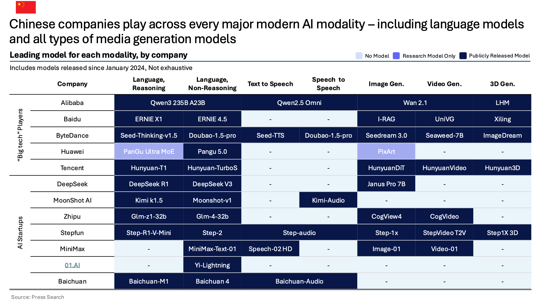 中国公司在所有主要现代AI模态中均有布局——包括语言模型和所有类型的媒体生成模型