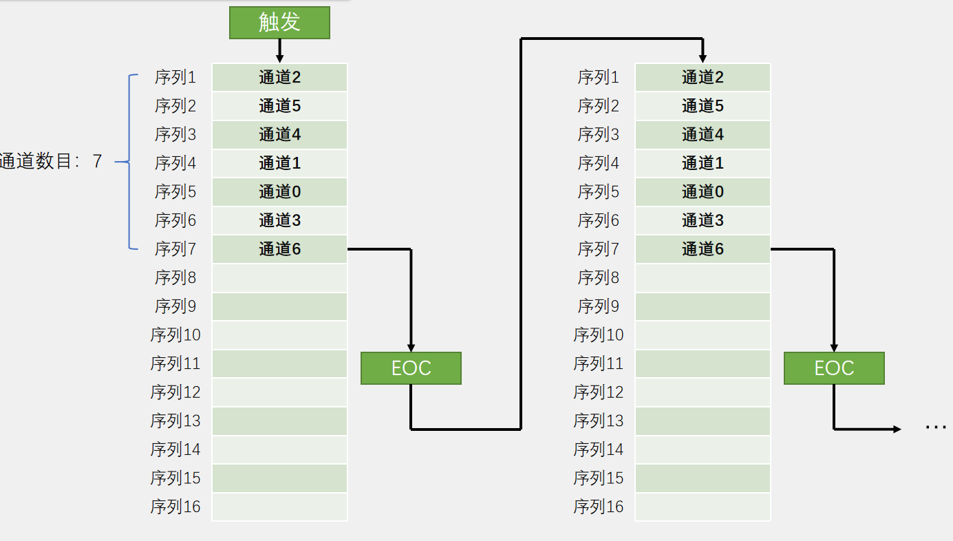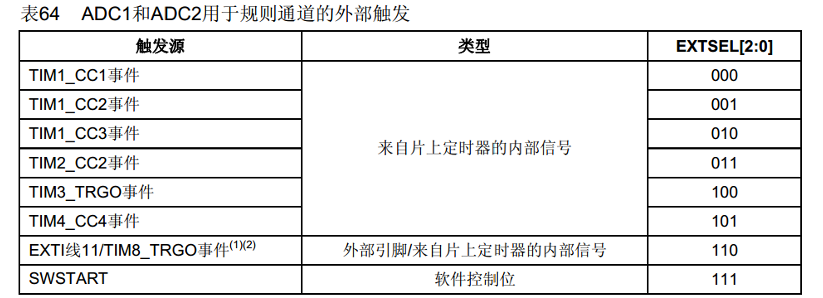 例如:当ADCCLK=14MHz,采样时间为1.5个ADC周期 TCONV = 1.5 + 12.5 = 14个ADC周期 = 1μs