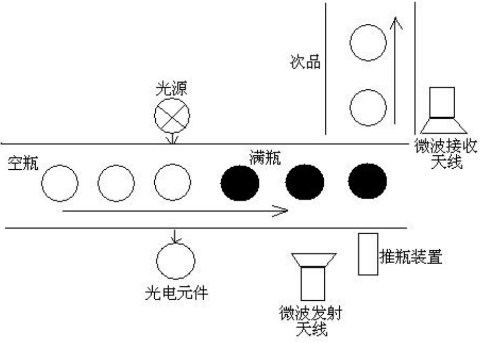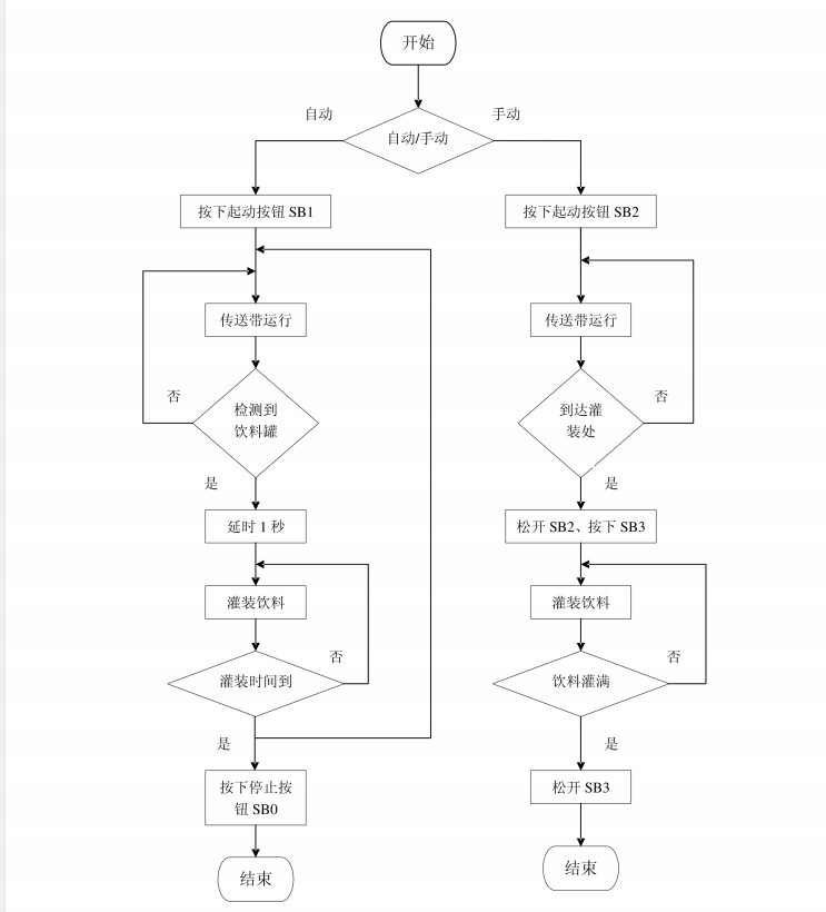 (1) 统通过开关设定为自动操作模式, 一旦启动, 则传送带的驱动电机启动并一直保持到停止开关动作或罐装设备下的传感器检测到一个瓶子时停止; 瓶子装满饮料后, 传送带驱动电机必须自动启动, 并保持到又检测到一个瓶子或停止开关动作。