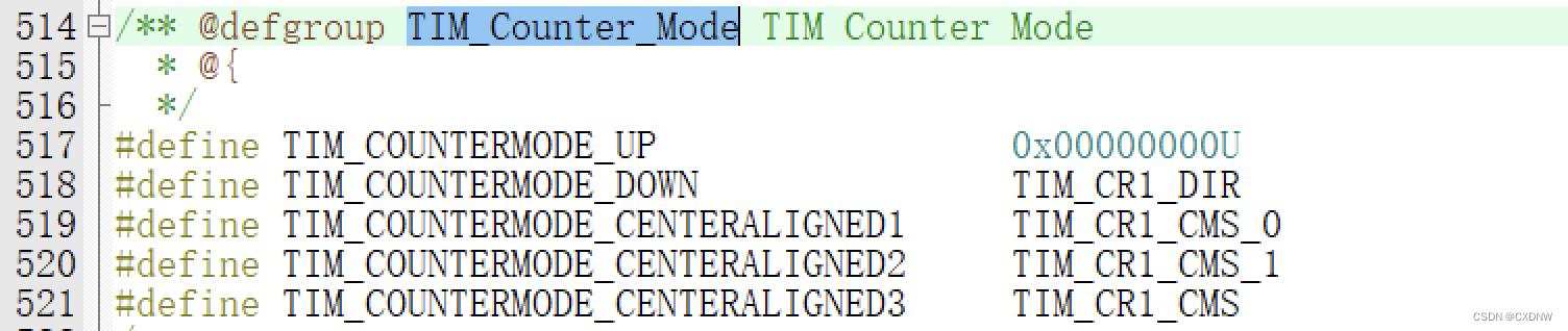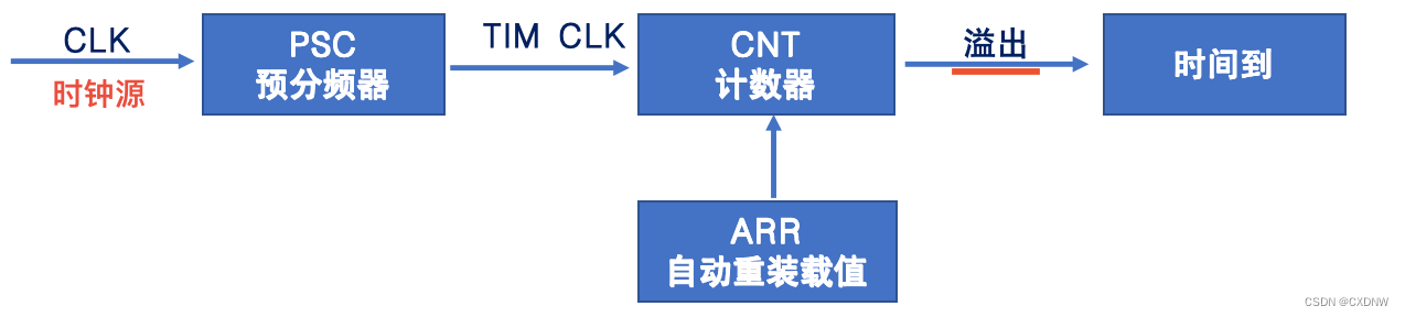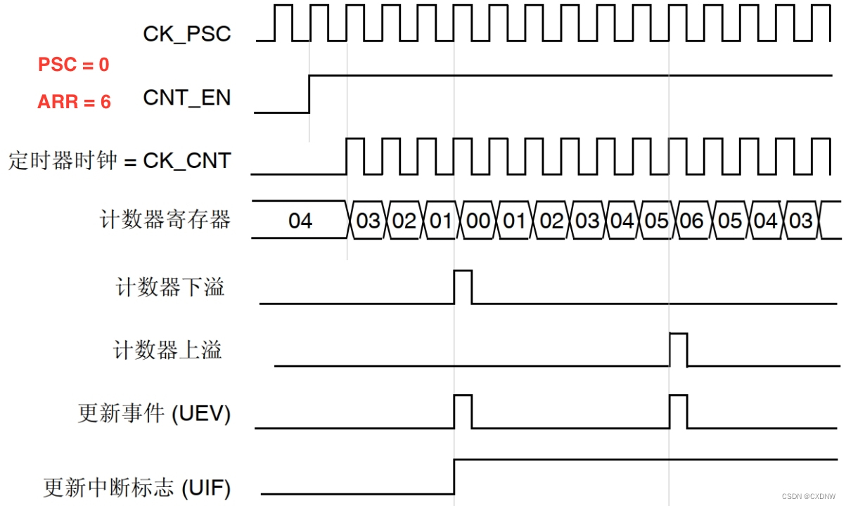 计数器从自动装入的值(TIMX_ARR计数器的值)开始向下计数到‘0’,然后从自动装入的值重新开始并且产生一个计数器向下溢出事件。