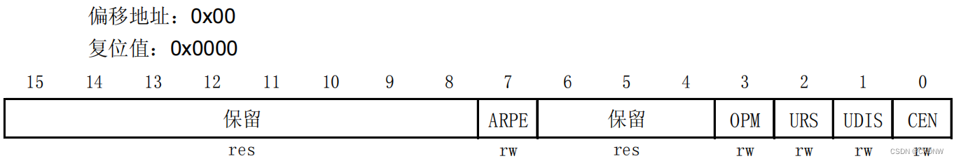 位7(ARPE):自动重装载预装载使能,配置TIMx_ARR寄存器有缓冲(减少操作ARR寄存器所产生的误差)