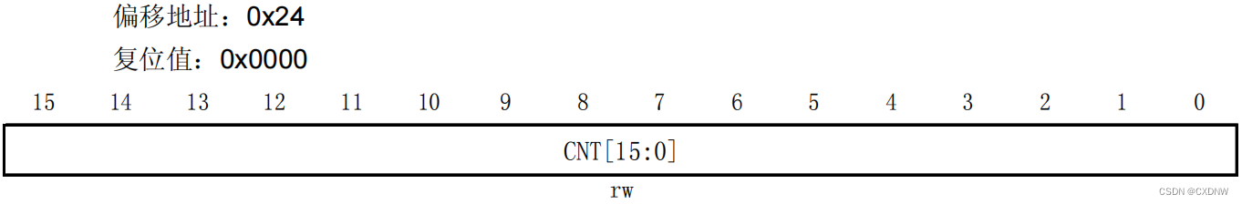 计数器 CNT 是一个16位的计数器,只能往上计数,最大计数值为65535。当计数达到自动重装载寄存器的时候产生更新事件,并清零从头开始计数。