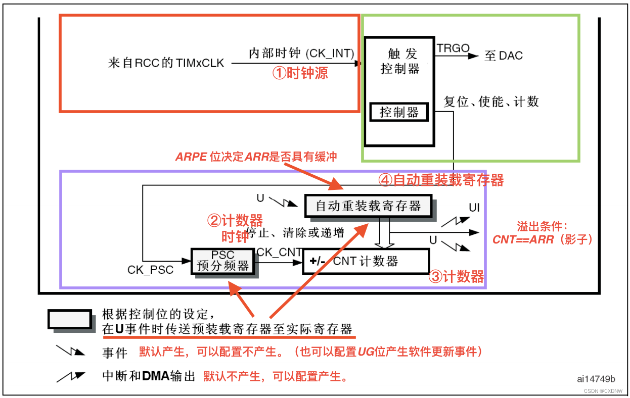 ④在更新事件(计数器溢出)时,会产生中断/DMA请求
