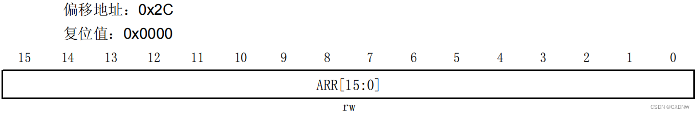 自动重装载寄存器TIMx_ ARR是一个16位的寄存器,这里面装着计数器能计数的最大数值。当计数到这个值的时候,如果使能中断的话,定时器就产生溢出中断。