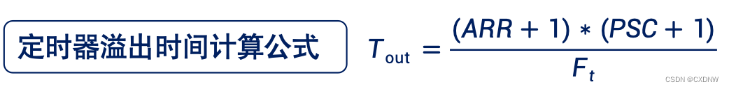 定时器时钟经过PSC预分频器之后,即CK_CNT,用来驱动计数器计数。PSC是一个16位的预分频器,可以对定时器时钟TIMx_CLK的1~65536之间的任何一个数进行分频。具体计算方式为:CK_CNT=TIMx_CLK/(PSC+1)。