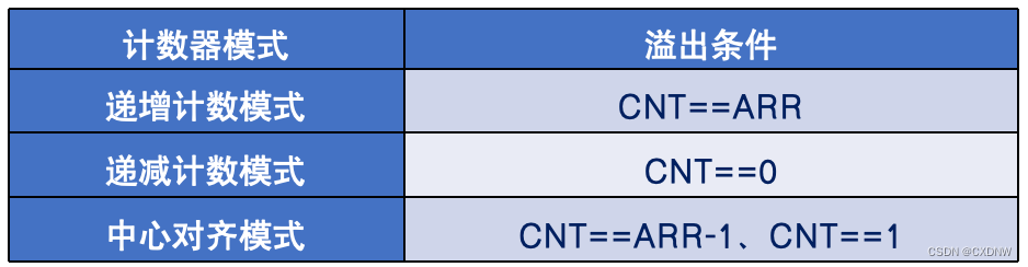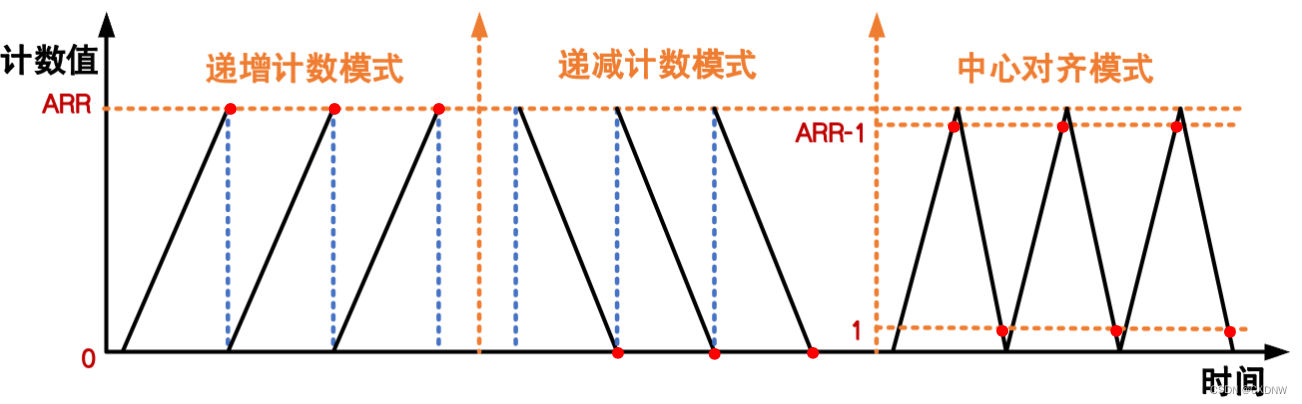 计数器从‘0’开始计数到‘自动加载的值(TIMX_ARR寄存器)-1’,产生一个计数器溢出事件,然后向下计数到‘1’并且产生一个计数器下溢事件;然后再从‘0’开始重新计数。