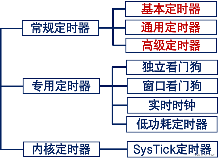STM32F1系列中,除了互联型的产品,共有8个定时器,分为基本定时器、通用定时器和高级定时器。