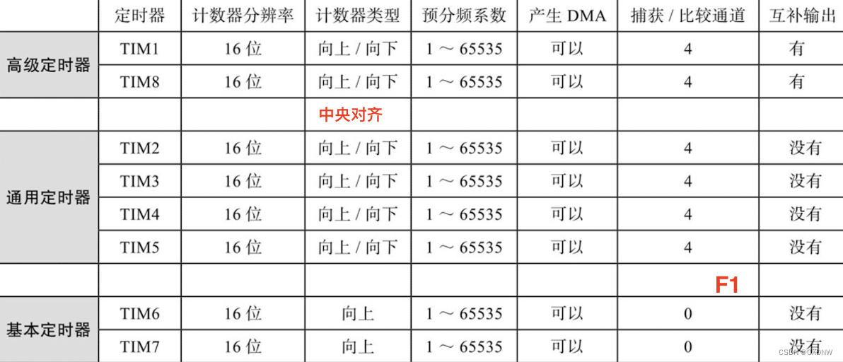 (3)高级定时器:可以向上/下计数的定时器,可以定时,可以输出比较,可以输入捕捉,还可以有三相电机互补输出信号,每个定时器有8个外部IO,还具备带死区控制的互补信号输出、刹车输入等功能(可用于电机控制、数字电源设计等)