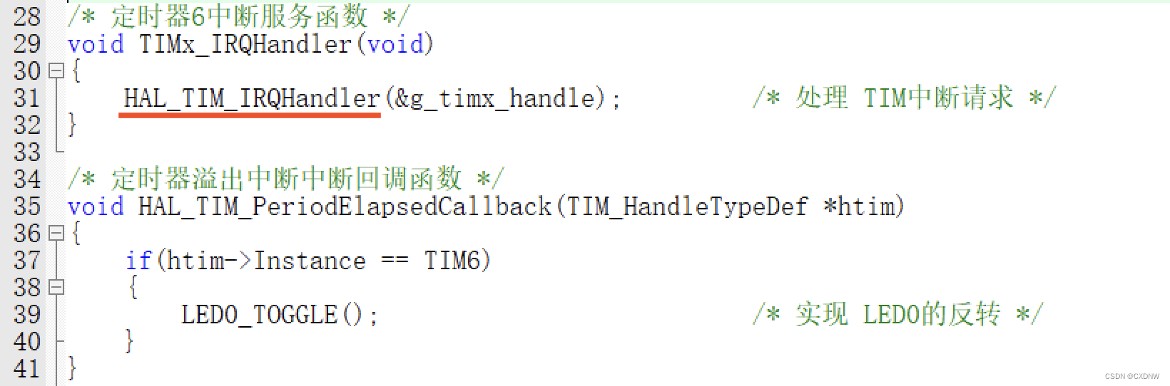 (5)编写中断服务函数:TIMx_IRQHandler()等 -> HAL_TIM_IRQHandler()(对相应的中断标志位进行详细判断,判断确定中断来源后,会自动清掉该中断标志位,同时调用不同类型中断的回调函数)