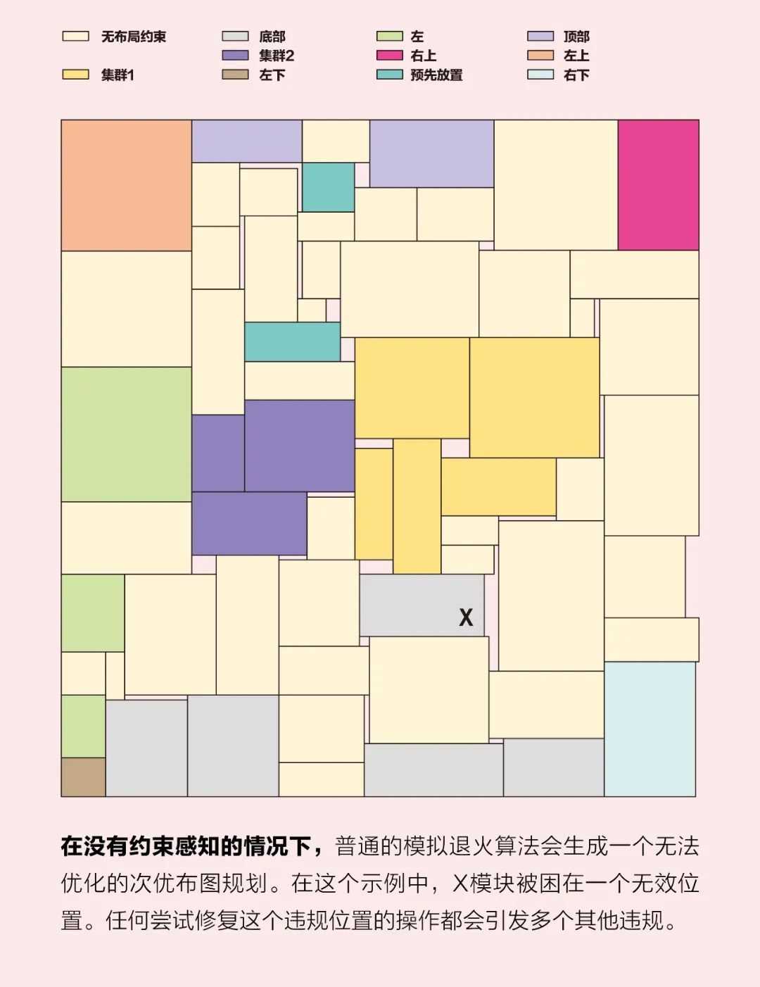 当然,现实中的设计问题存在约束条件。因此,我们给模拟退火算法增加了一些与机器学习模型相同的约束条件,包括对某些模块位置的限制以及模块分组要求。最初,我们尝试通过在我们的成本函数中加入布图规划违反硬性约束的次数来应对这些约束。这样一来,当算法随机调整模块,导致违反约束的次数增加时,我们就更可能拒绝这些操作,从而引导模型避开它们。