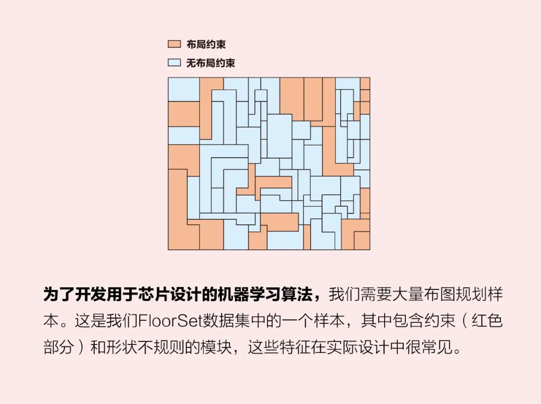 在目标单一的情况下,比如将功能模块塞进最小的硅片面积里,商业布图规划工具可以在短短几分钟内解决这种规模的问题。然而,涉及多个目标和约束条件时,比如特定模块的位置规则、模块形状的限制,或者必须要将某些模块放置在一起时,这些工具往往难以应付。因此,人类设计师需要频繁依靠试验和自身的创造力,这会导致生产进度延长数小时甚至数天。而这仅仅是一个子阶段的工作。