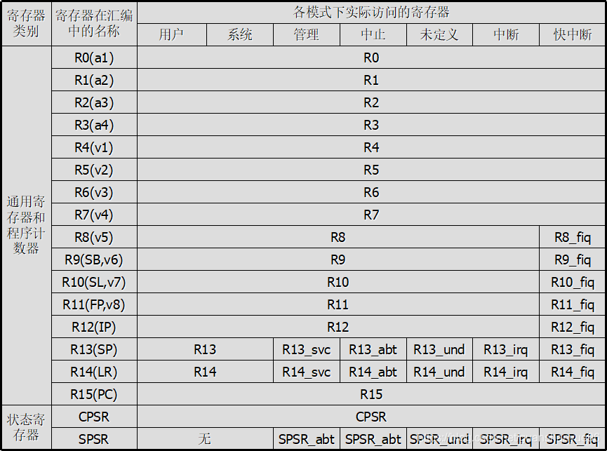(1)R0-R7 - 不分组寄存器。是所有处理器模式下共用的寄存器,在模式切换时必须压入堆栈保护。