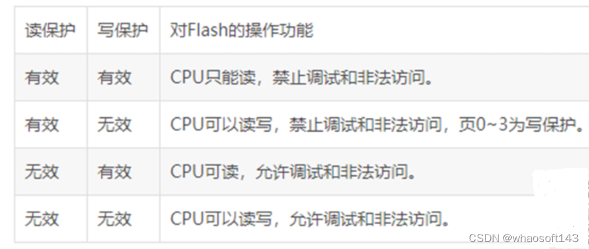 写保护是以四页(1KB/页) Flash存储区为单位提供写保护,对被保护的页实施编程或擦除操作将不被执行,同时产生操作错误标志,读与写设置的效果见下表: