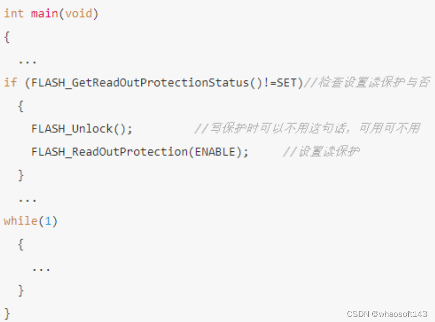 上面的代码执行后,使用j-link就不能读出程序了,实现了代码读保护。需要注意的是,芯片读保护后无法再次烧写新的程序到Flash中,必须要解除读保护才可以。但是当解除读保护的时候STM32会自动擦除整个Flash,起到保护数据的作用。