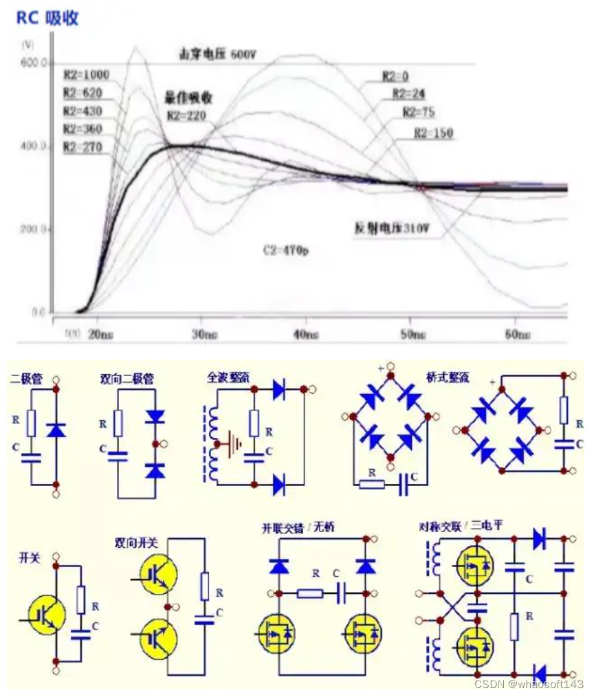 C 的大小决定吸收效果(电压尖峰),同时决定了吸收功率(即R的热功率)。