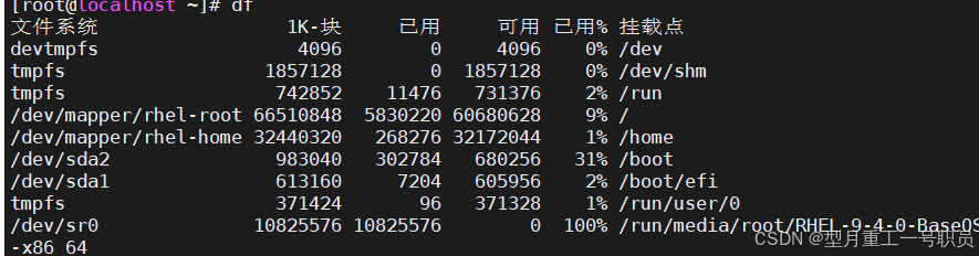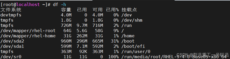 df(Disk Free):用于显示磁盘空间使用情况的命令。它显示每个文件系统(通常是磁盘分区)的总空间、已用空间、可用空间以及挂载点。df命令对于监控磁盘空间和确定何时需要清理或扩展存储非常有用。