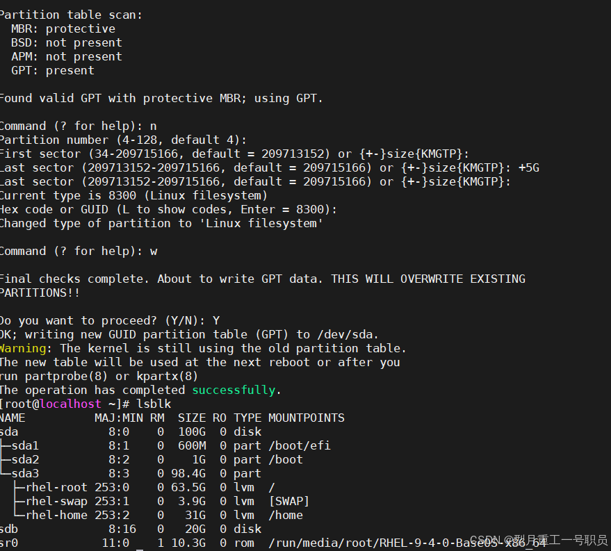 注意:gdisk命令针对GPT分区格式,若在MBR分区格式下进行添加分区,则所有数据会全部丢失,切记:一块硬盘中fdisk与gdisk不能混用