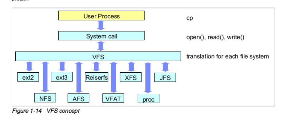 虚拟文件系统(VFS)是一个处于用户进程和各类文件系统之间的抽象接口层, VFS提供访问文件系统对象的通用对象模型(例如, i-node、 文件对象、 页缓存、 )和方法, 它对用户进程隐藏了各种文件系统的差别。 正是因为有VFS,所以用户进程不用关心使用的是那种文件系统, 也更不需要知道各个文件系统应该使用哪个系统调用。 下图显示了VFS的概况。