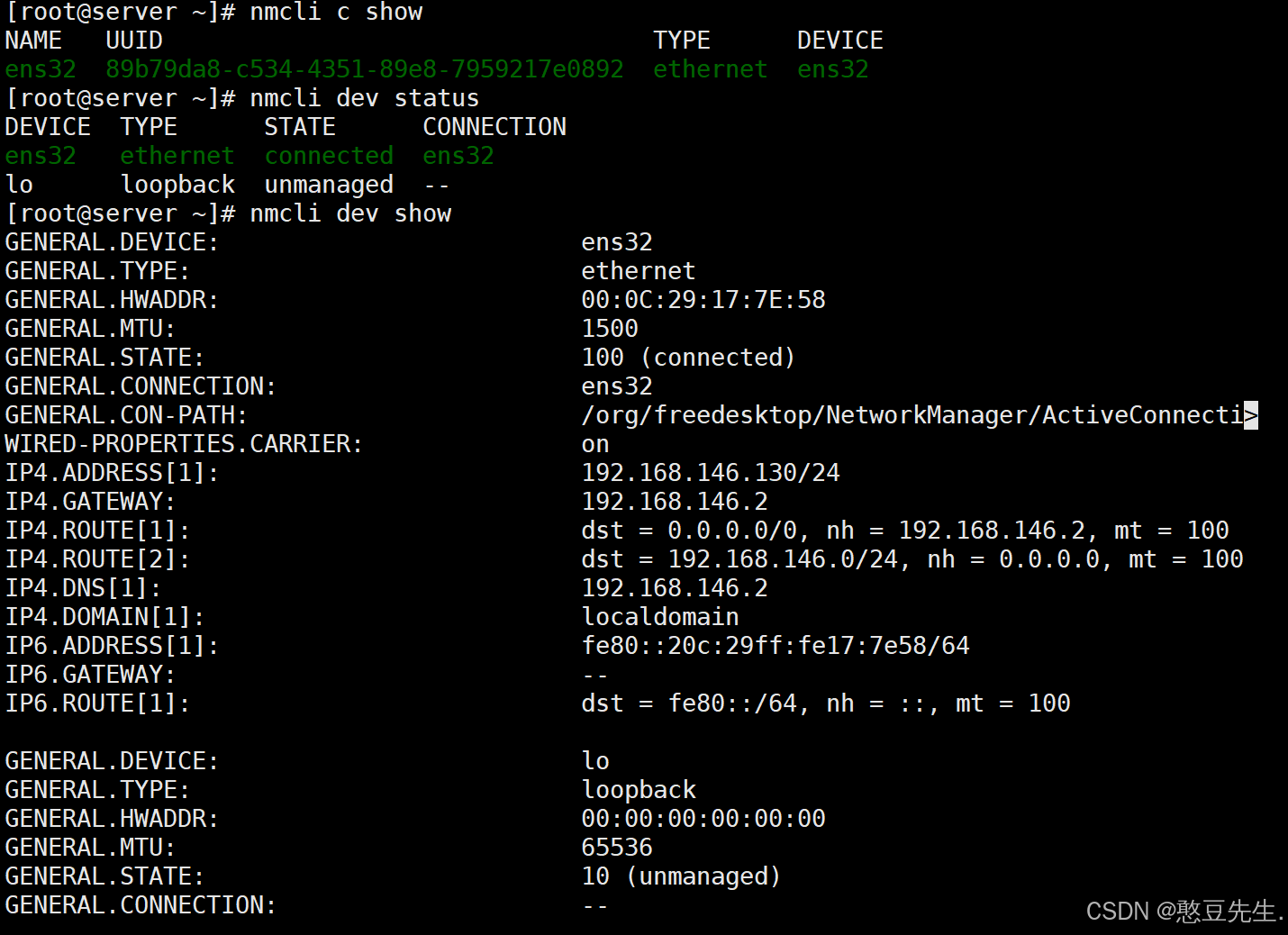 [root@server ~]# nmcli dev show # 查看所有硬件设备状态