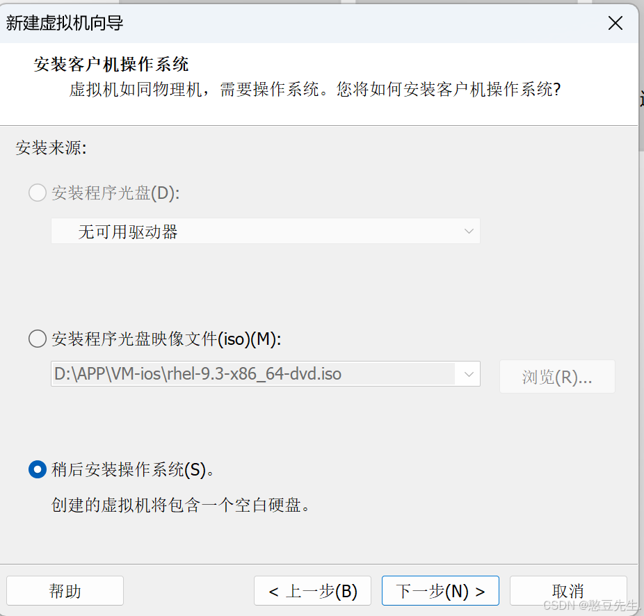 新CD/DVD:适应ISO映像文件,点击浏览按钮,选择之前下载好的openEuler-22.03-LTS-SP2-x86_64-dvd.iso镜像文件