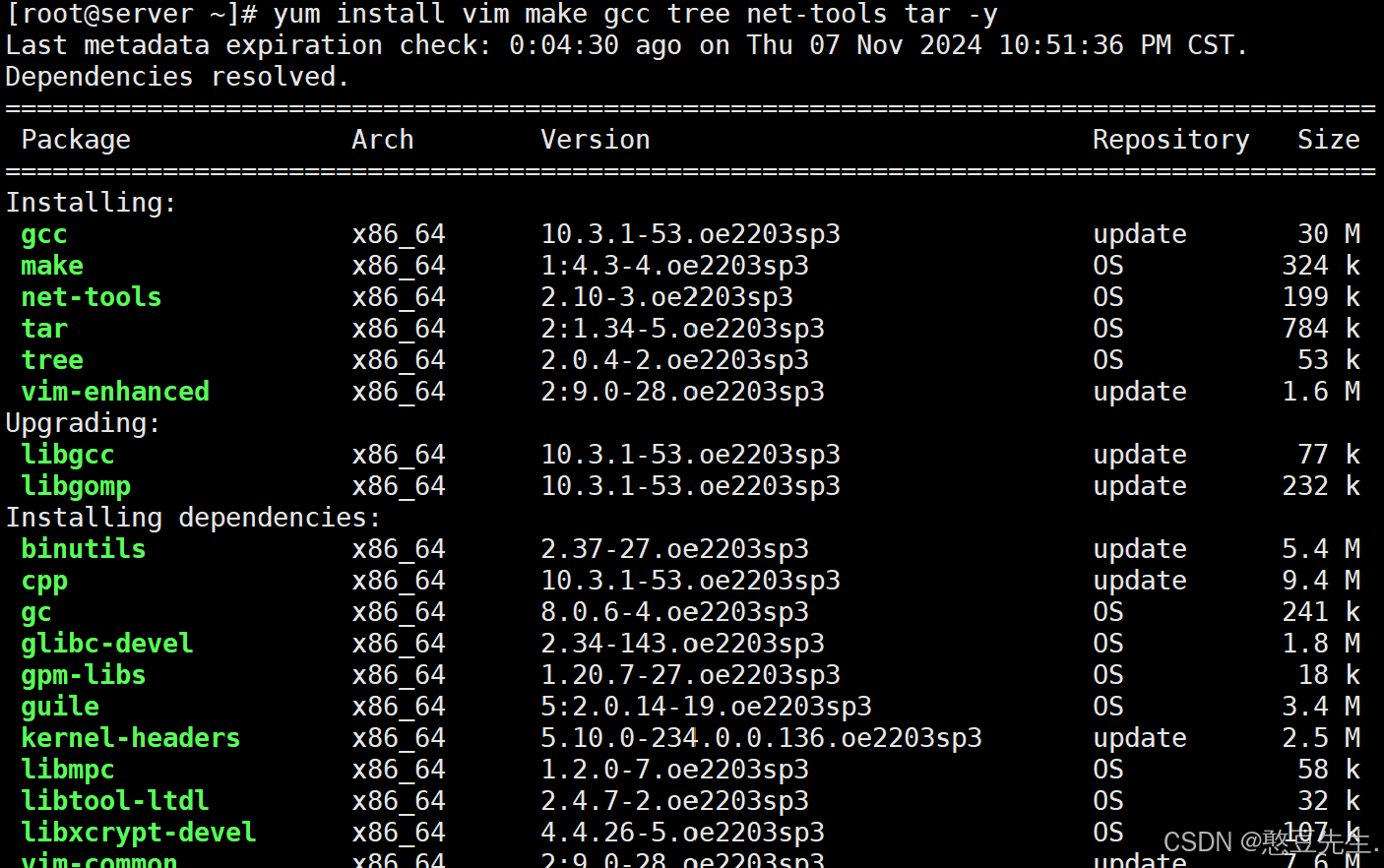 [root@server ~]# yum install vim make gcc tree net-tools tar -y