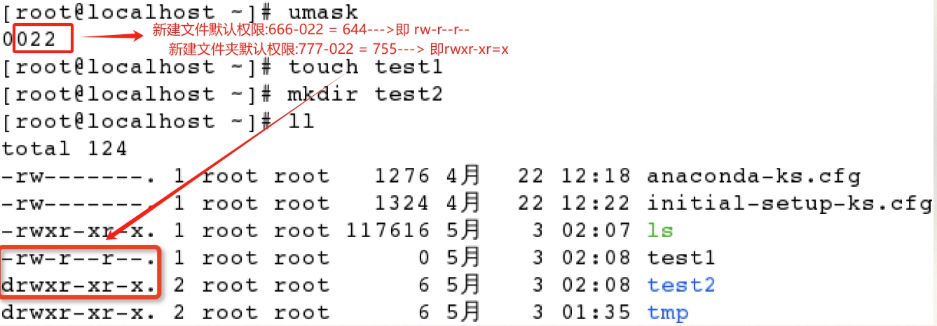 ➡ 新建目录的默认权限=777 - umask值