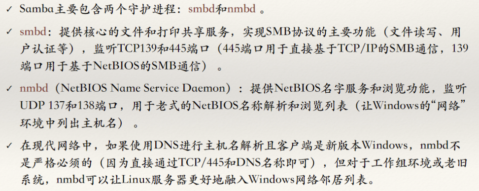 - Samba通过实现SMB/CIFS,使得Linux服务器能与Windows客户端进行无缝的文件共享