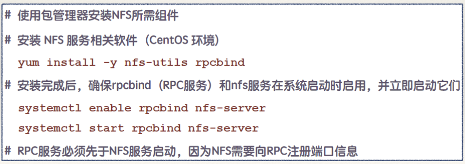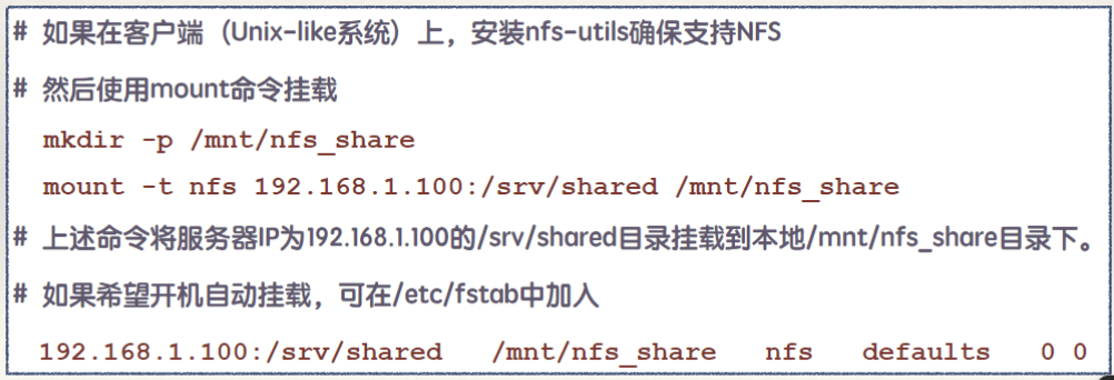 - NFS的核心思想是允许一台机器将本地文件系统的一部分"导出"给网络上的其它主机,使远程主机能够通过网络挂载这个文件系统,并像访问本地磁盘一样访问其中的文件