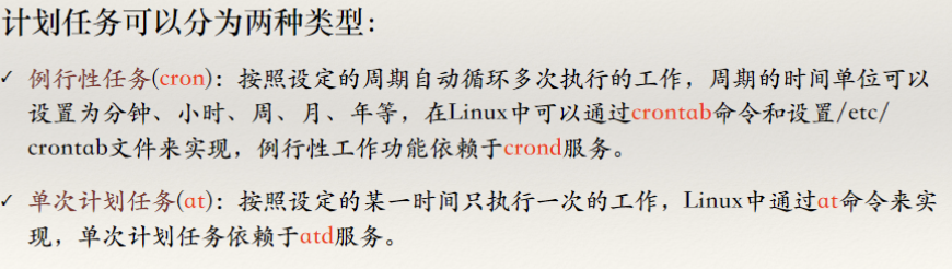 计划任务也被称为例⾏性⼯作,在Linux系统中是指由系统在某⼀时间或周期性自动执行的程序或应用。